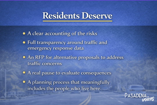 What is especially troubling is how little the City Council has involved the people who would be most affected. West Pasadena residents, particularly those along Orange Grove Boulevard where much of the diverted traffic would land, have not been meaningfully consulted.